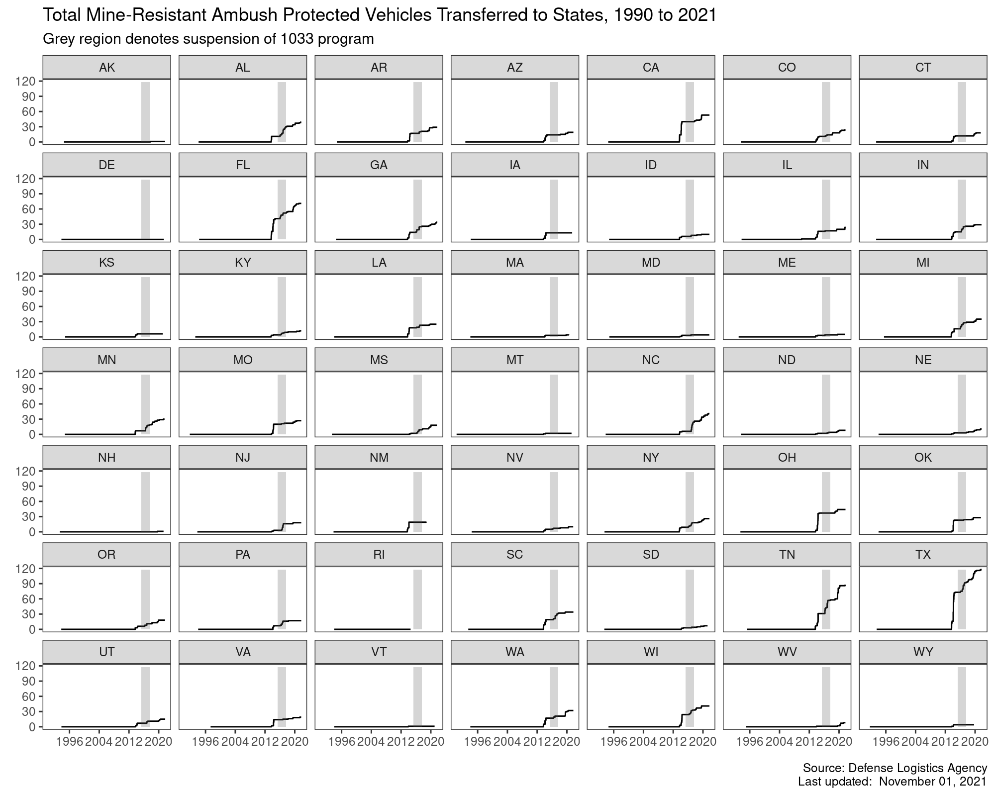 By 2021 only 3 states have not received a single MRAP (Hawaii is not included in the data from DLA, although the Marshall Project’s database records that the FBI has received 3). The grey band in each panel of the plot marks the suspension of the 1033 program from 2014 to 2017. While some states like Connecticut and New Mexico demonstrate a freeze in transfers during this period, others like Tennessee and New Jersey continued to receive multiple vehicles. To date, the state that has received the most MRAPs is Texas with a whopping 118 vehicles.