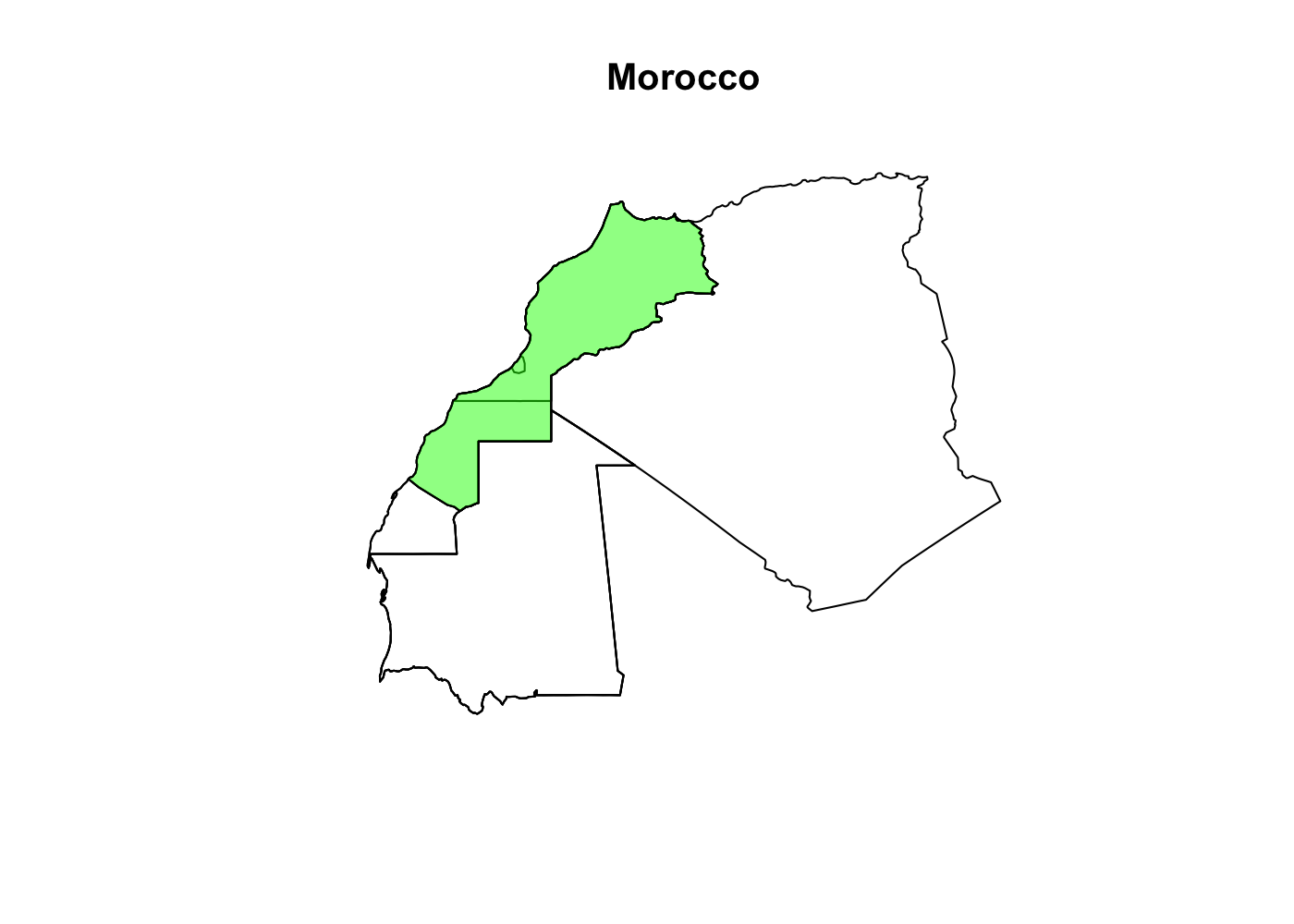 If you use the tidyverse a lot, this may seem familiar to you because it’s pretty similar to dplyr syntax, except dplyr already knows which data frame you want to work with. If we want to only load one polygon at a time into R, then we need to know the field (or combination of fields) that uniquely identifies a polygon. To demonstrate, let’s load just the polygon for Morocco that begins in 1976 when it annexed the Northern part of Western Sahara. Let’s cheat by looking at the data I’ve loaded into R: